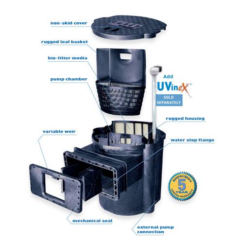 Removes up to 85% of debris before it settles to the bottom. Macro filtration traps large debris for easy removal. Optional UV clarifier eliminates green water. Biological and mechanical filtration polishes the water.